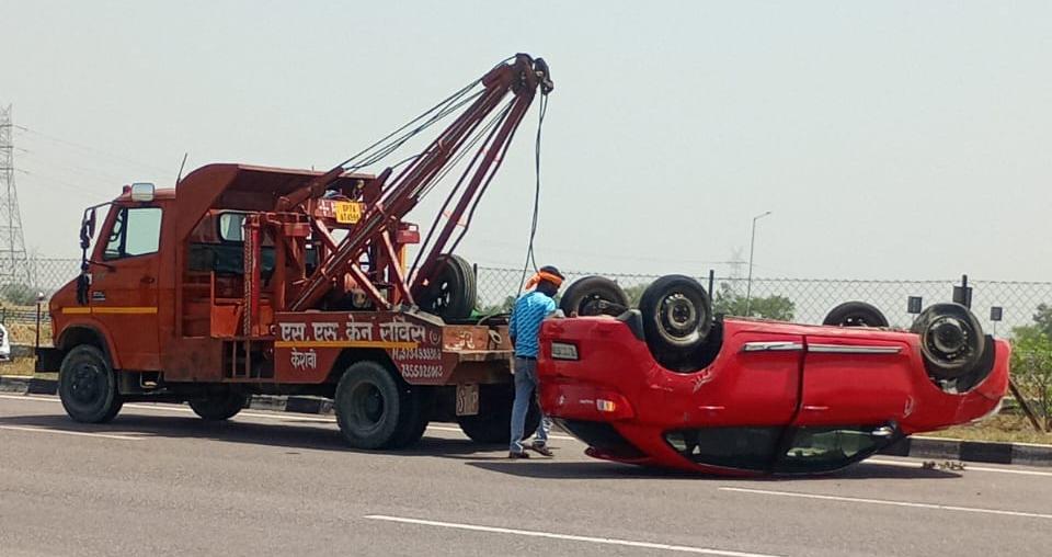 लखनऊ-आगरा एक्सप्रेसवे पर भीषण कार हादसा; पलटी गाड़ी, माँ-बेटे बाल-बाल बचे